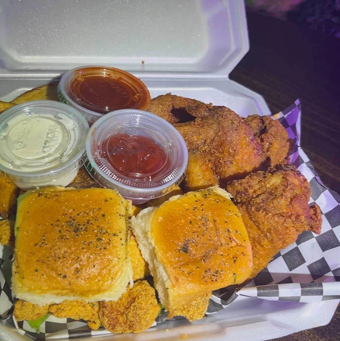 Categories: All Burger Sliders Catfish Sliders Crack Buffalo Lemon Pepper Lemon Pepper Honey Lemon Pepper Hot Honey BBQ Honey Ranch House Date Night All | Burger Sliders | Catfish Sliders | Crack | Buffalo Lemon Pepper | Lemon Pepper | Honey Lemon Pepper | Hot Honey BBQ | Honey Ranch | House | Date Night | Combo Box $20.00 Catfish Nugget Box $16.00 Chicken Box $16.00 Mac Bowl w/ Honey Hot Chicken Bites $12.00 Philly Chopped Cheese $15.00 Catfish Sliders $13.00 Burger Sliders $12.00 Chipotle Bowls “For the Healthy Hoes” $12.00 Hot Links and Chips $10.00 Wedges $6.00 Side Mac $6.00 Lemon Cake $5.00 Strawberry Cake $5.00 Sizzle Sessions $50.00